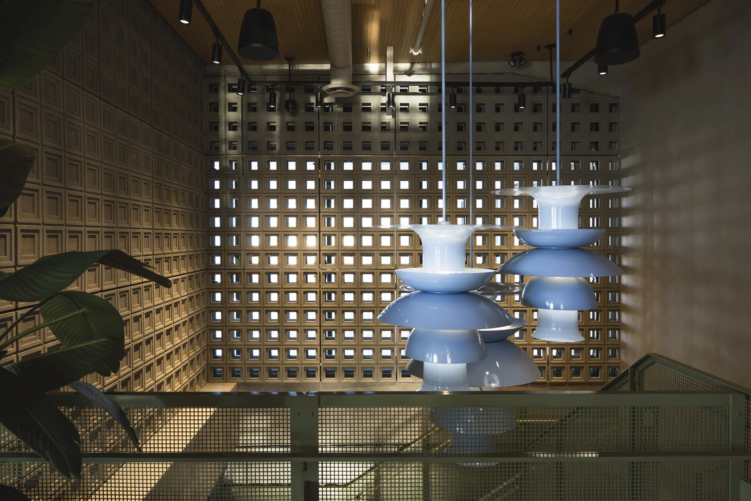 Its classic, mid-century modern breeze block design creates a wonderful three-dimensional depth while providing natural light and air flow throughout the restaurant.