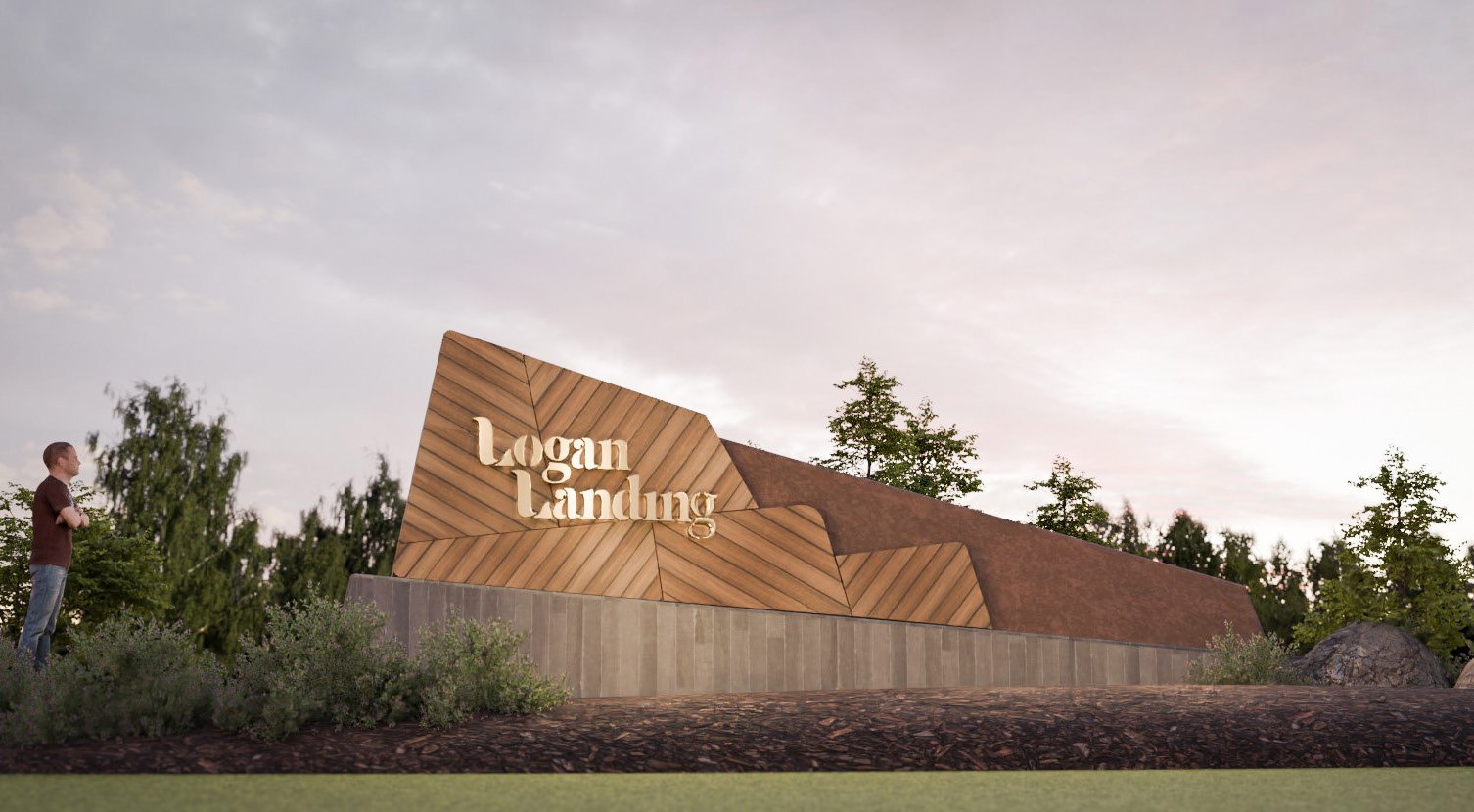 Logan Landing’s entry feature is a sophisticated, layered installation designed to mirror the natural topography of the surrounding landscape.