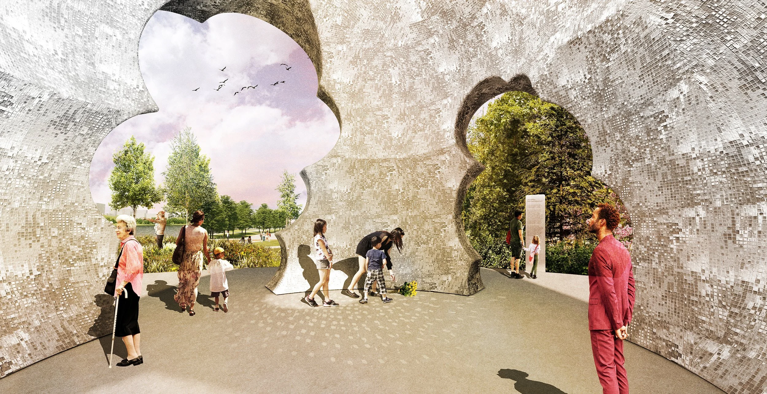 The inside, hollowed center is lined with thousands of mirrored tiles, creating an infinite play of light that reflects the diverse identities of visitors in a sparkling celebration.