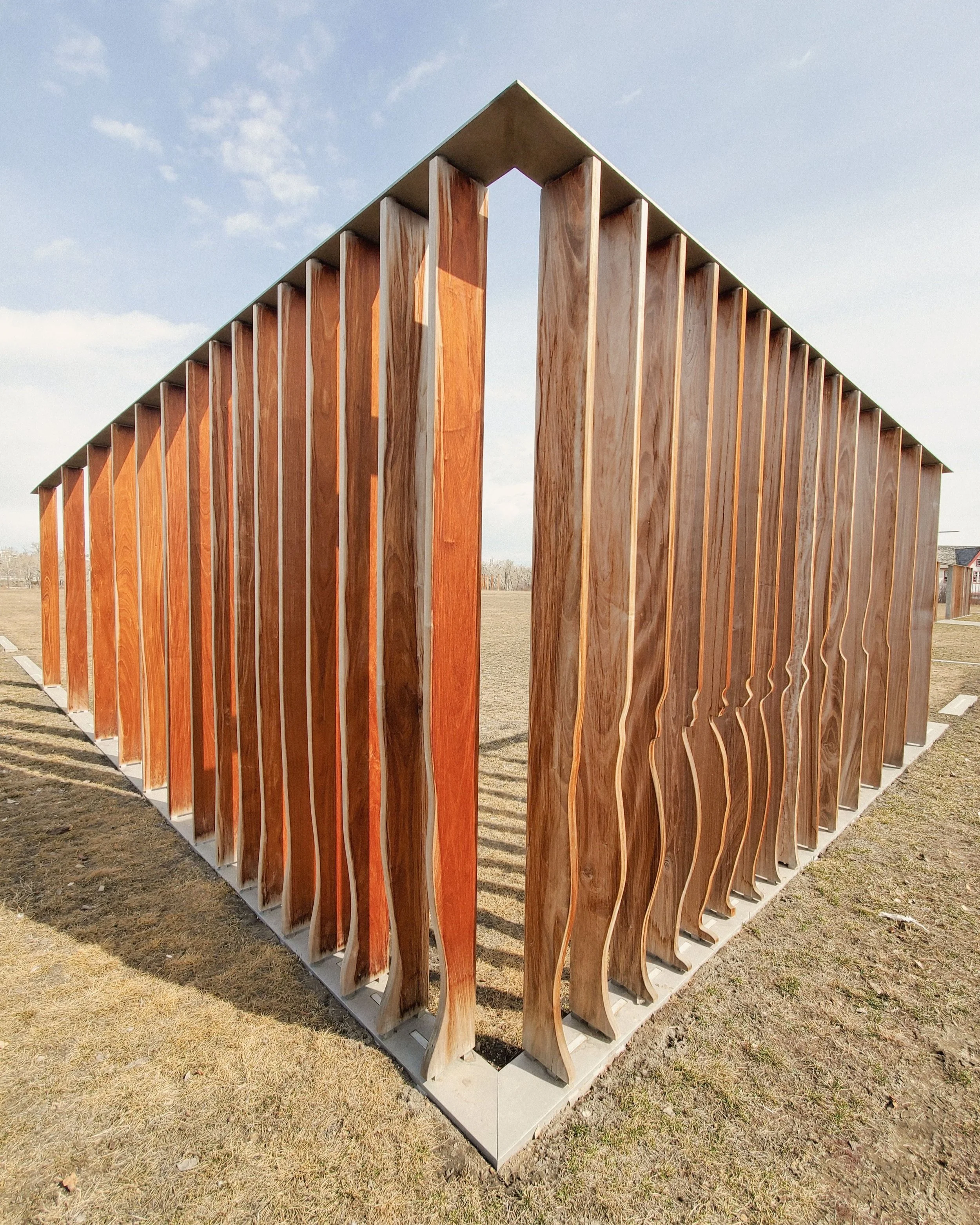 A combination of stainless steel, Ipê wood slats, and diffused led display lighting is used to mark out the perimeter of the original 1875 Fort Calgary.