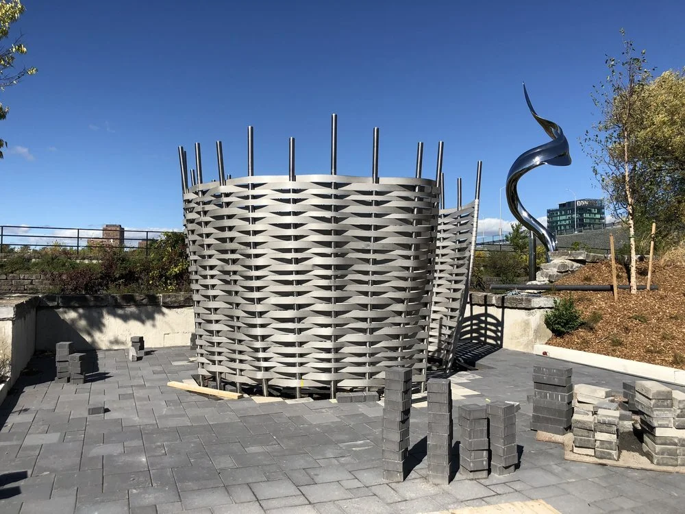 The work is composed of 2 pieces, the most notable being a 30′ high chrome “Pimisi”. The word Pimisi comes from the Anicinàbemowin name for the river eel that calls the area home. The second feature is a basket, made of interwoven steel bands, reminiscent of the woven ash baskets used for fishing by the Algonquin First Nation’s people of the surrounding area.